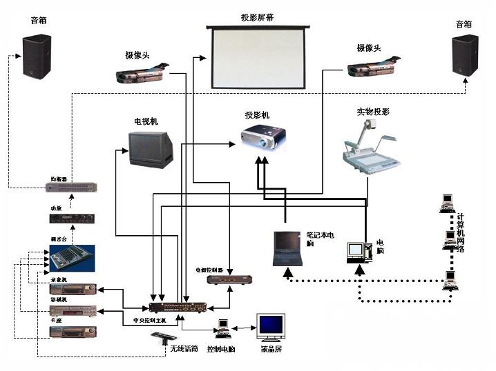 多媒體電教室綜合控制系統(tǒng)是現(xiàn)代化的教學(xué)設(shè)備。該系統(tǒng)包含了全部電化教學(xué)、計算機輔助教學(xué)和演示手段,是目前頗受歡迎、便于使用、效果理想的教學(xué)演示系統(tǒng),它將多媒體計算機、多媒體交互白板、多媒體投影機等先進(jìn)的視聽設(shè)備以及其它可遙控設(shè)備(如電動幕、中控、音箱等)有機的連接,構(gòu) 成現(xiàn)代化視聽教學(xué)環(huán)境。