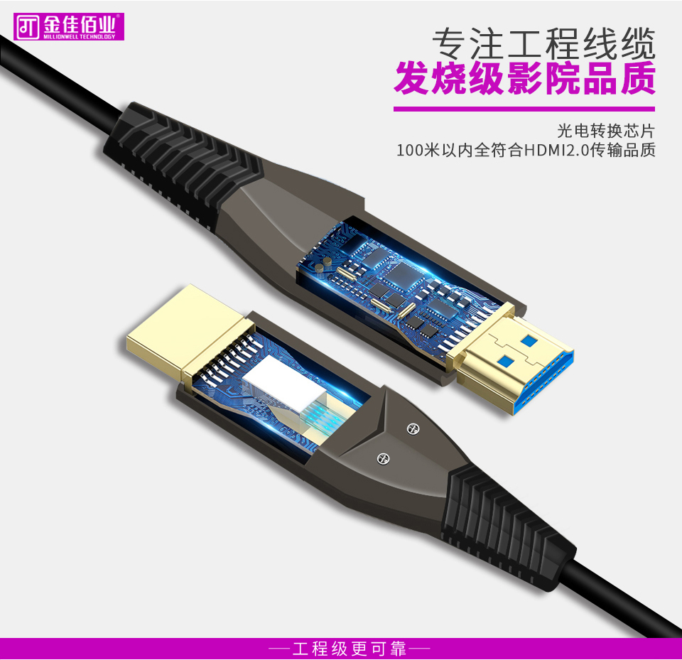 電光火石的光電轉(zhuǎn)換過程,是HDMI廠家需要攻克的關(guān)鍵點(diǎn)和難點(diǎn)。金佳佰業(yè)光纖HDMI線采用的是光電復(fù)合纜的結(jié)構(gòu),以銅線導(dǎo)電,以光纖傳輸信號(hào)。需要通過兩次光電轉(zhuǎn)換才能實(shí)現(xiàn)信號(hào)傳輸,一次是電信號(hào)轉(zhuǎn)成光信號(hào),然后光信號(hào)在光纖線內(nèi)傳輸,然后再有光信號(hào)轉(zhuǎn)為電信號(hào),實(shí)現(xiàn)信號(hào)由SOURCE端到DISPLAY端的有效傳輸。