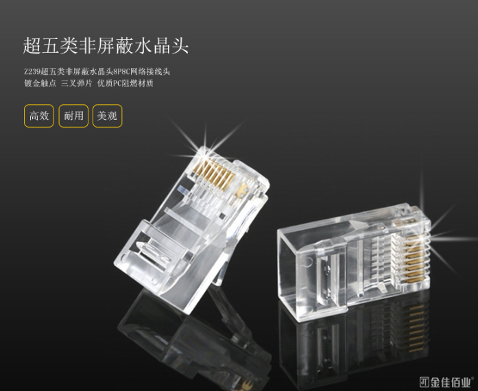 以上就是關(guān)于超五類(lèi)網(wǎng)線水晶頭與六類(lèi)網(wǎng)線水晶頭有什么不同就介紹到這,水晶頭是一種能沿固定方向插入并自動(dòng)防止脫落的塑料接頭,用于網(wǎng)絡(luò)通訊。因其外觀像水晶一樣晶瑩透亮而得名為“水晶頭”。主要用于連接網(wǎng)卡端口、 集線器, 交換機(jī)、電話等。每條雙絞線兩頭通過(guò)安裝水晶頭與網(wǎng)卡和集線器(或交換機(jī))相連。