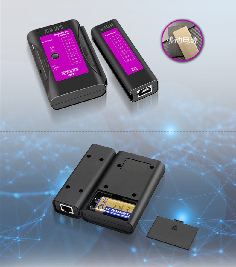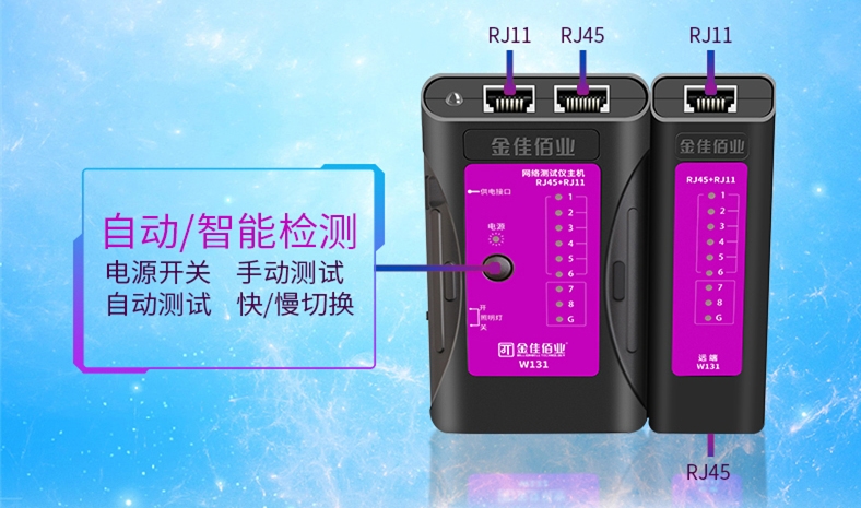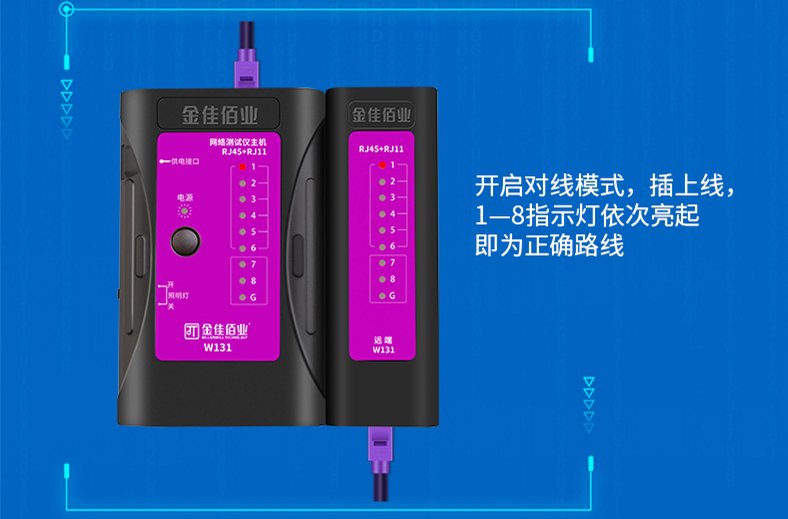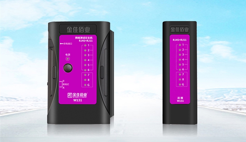 金佳佰業(yè)W131網(wǎng)絡測試儀為網(wǎng)線與電話線二合一多功能檢測工具,可對RJ45網(wǎng)絡端口和RJ11電話端口進行測試,對電話線纜、網(wǎng)絡線纜等進行線路的通斷檢測與判定時,可通過多功能按鍵在手動點對點測試與自動測試之間自由切換,常用于綜合布線施工中。