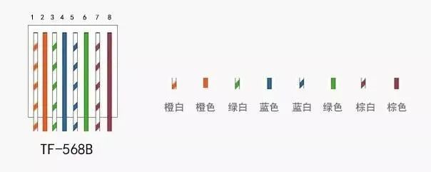 RJ45水晶頭接線時則有兩種線序標(biāo)準(zhǔn):T-568A和T-568B。通過采用不同的標(biāo)準(zhǔn),最后制作成的網(wǎng)線有直通型和交叉型兩種?,F(xiàn)在所有的網(wǎng)線制作都采用的是568B,線序如下:
