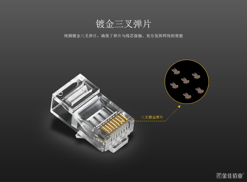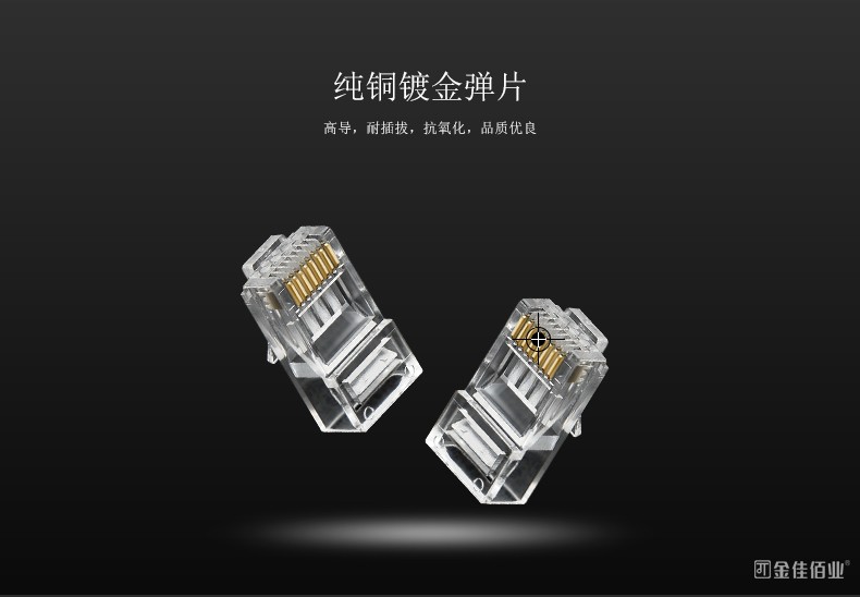選擇彈性好不易斷裂的彈片水晶頭,品質(zhì)好的水晶頭將彈片向前波動到90度,彈片也不會輕易斷裂,經(jīng)久耐用。將做好的水晶頭插入集線設(shè)備或者網(wǎng)卡中的時候能聽到清脆的“咔”的響聲。金佳佰業(yè)的水晶頭彈片強(qiáng)化,可以180度彎折無明顯折痕。