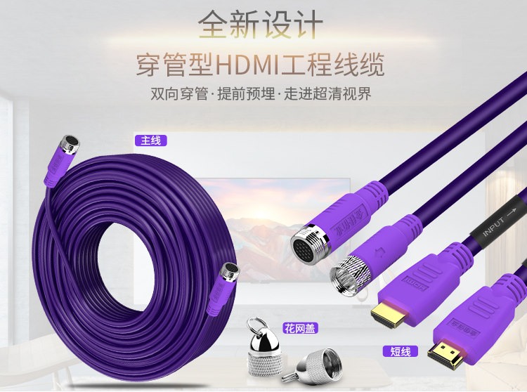 再者就是穿管的時候非常方便,常規(guī)的HDMI線穿管的時候由于線頭大小的限制,細(xì)一些的管子是沒法穿過的,這對于布線的時候也是一個問題,而穿管HDMI線的話,無需擔(dān)心這一問題,金佳佰業(yè)穿管HDMI線配備有花網(wǎng)蓋,扭上之后直接使用鐵絲綁住,鐵絲穿過管子,輕輕一拉,即可將HDMI線穿過管子,輕松助您完成穿管布線。
