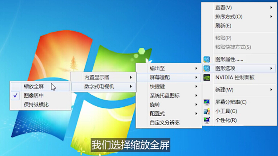 有的小伙伴在設(shè)置好之后會(huì)發(fā)現(xiàn)個(gè)問(wèn)題,那就是電視顯示的不是全屏,會(huì)有黑邊,對(duì)于有強(qiáng)迫癥的人來(lái)說(shuō),這是非常難受的問(wèn)題了,下面金佳佰業(yè)就叫大家怎么解決黑邊問(wèn)題。在桌面鼠標(biāo)右鍵單擊-圖形選項(xiàng)-屏幕適配-數(shù)字式電視機(jī)-縮放全屏 。如下圖示: