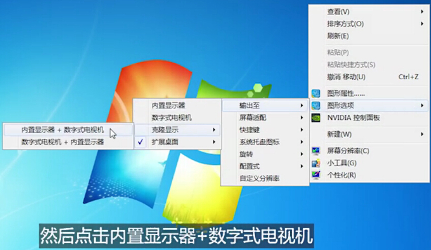 電腦桌面鼠標(biāo)右鍵-圖形選項(xiàng)-輸出至-擴(kuò)展桌面-內(nèi)置顯示器+數(shù)字式電視機(jī);這樣就可以了。