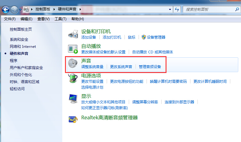 1、點(diǎn)擊電腦右下角 “開始”鍵,進(jìn)入控制面板,然后點(diǎn)擊“硬件和聲音”;
