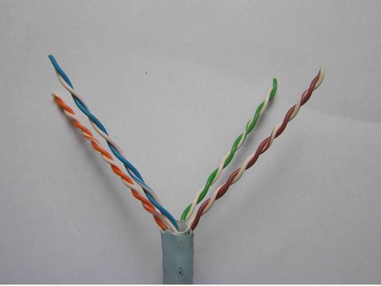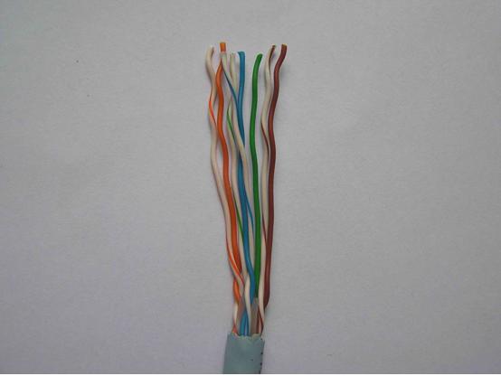 將線纜解紐,由于解紐直接影響到性能,所以應(yīng)注意解紐的長度不能太長,并將解紐后的導(dǎo)線理直,將導(dǎo)線按568B(白橙、橙、白綠、藍(lán)、白藍(lán)、綠、白棕、棕)或568A(白綠、綠、白橙、藍(lán)、白藍(lán)、橙、白棕、棕)(從左向右排)的順序理齊,不要讓線彎彎曲曲的。